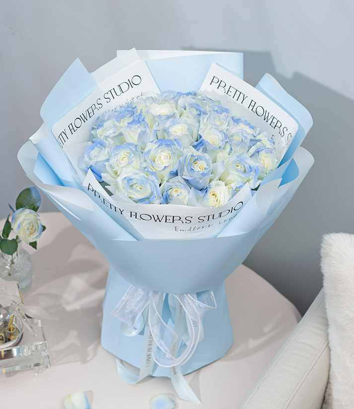 33枝碎冰蓝玫瑰(坦尼克白玫瑰,使用密西根碎冰蓝边缘喷淡蓝色工艺处理) 包装